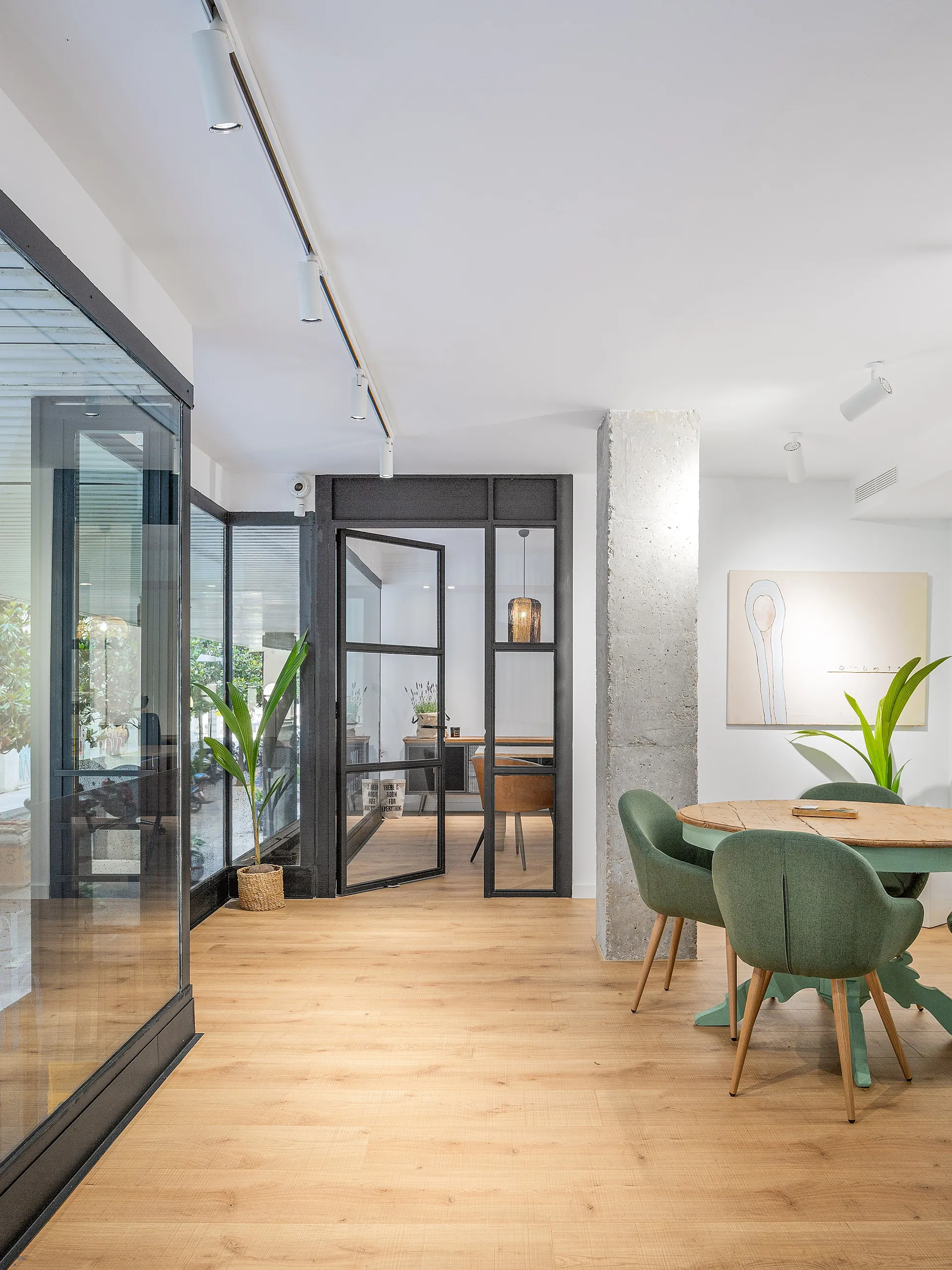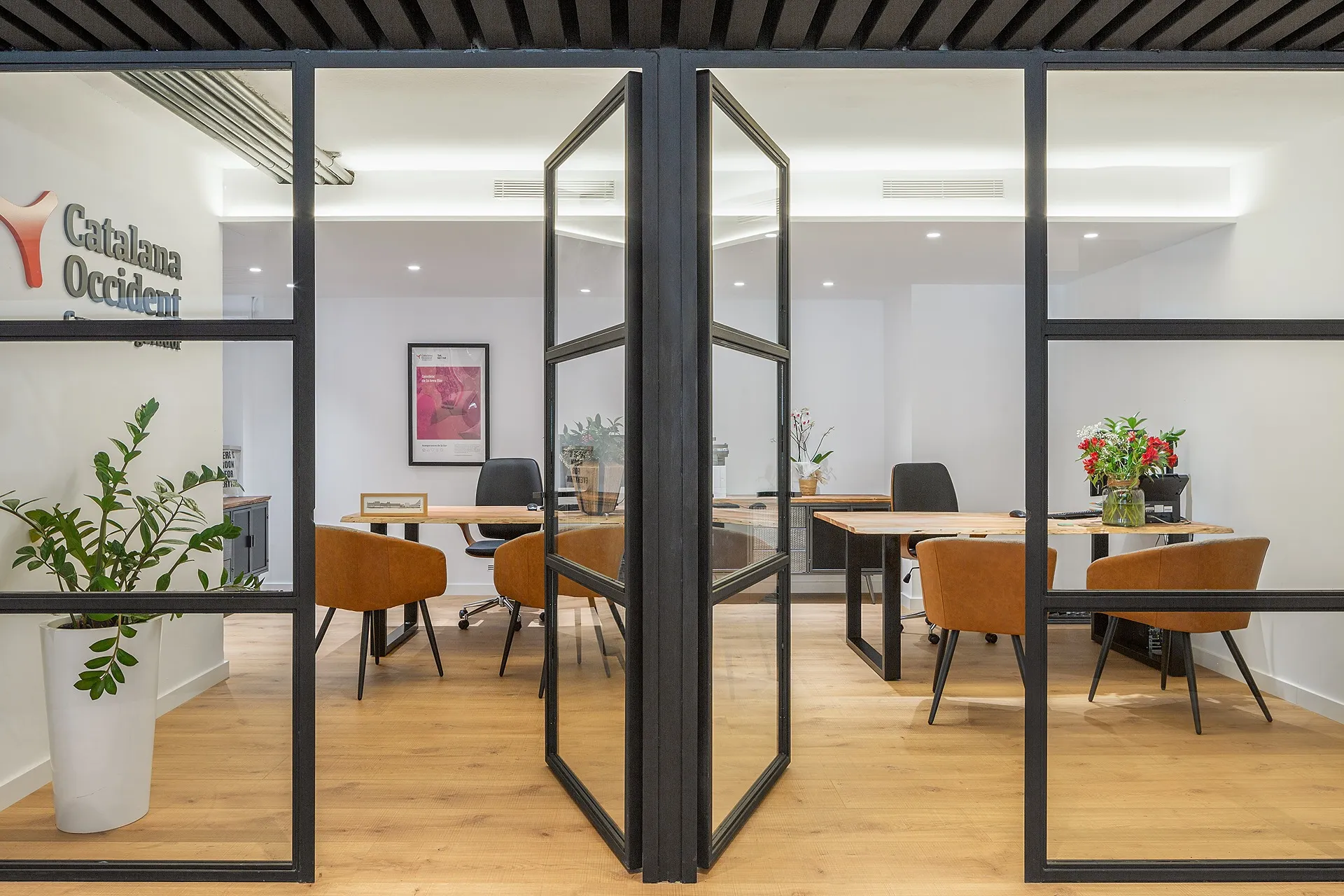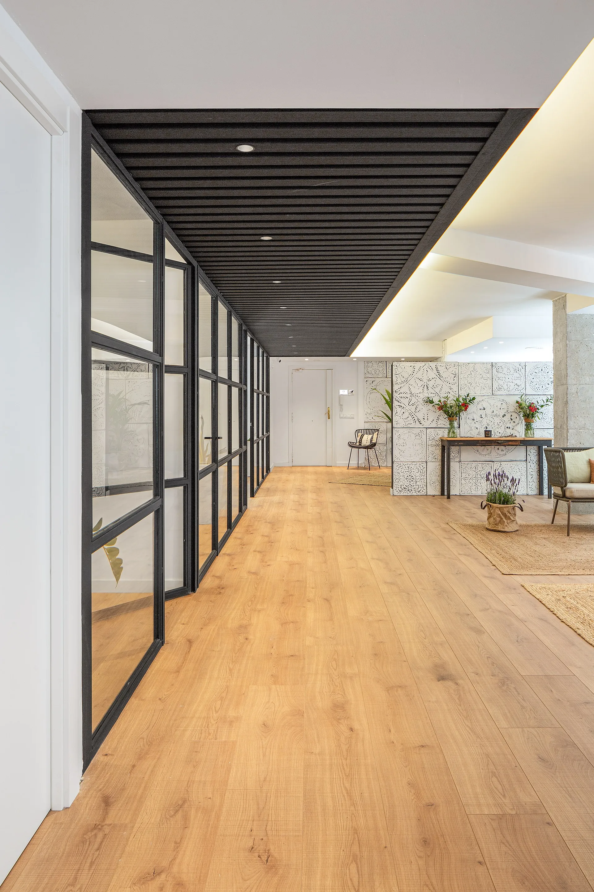 A l’entrada, una estructura metàl·lica de lames negres defineix la transició entre la zona comuna i l’àrea de treball intern. Aquesta estructura es complementa amb una successió de tancaments de vidre del mateix estil, que aporten transparència i continuïtat visual, tot mantenint la privadesa necessària.
