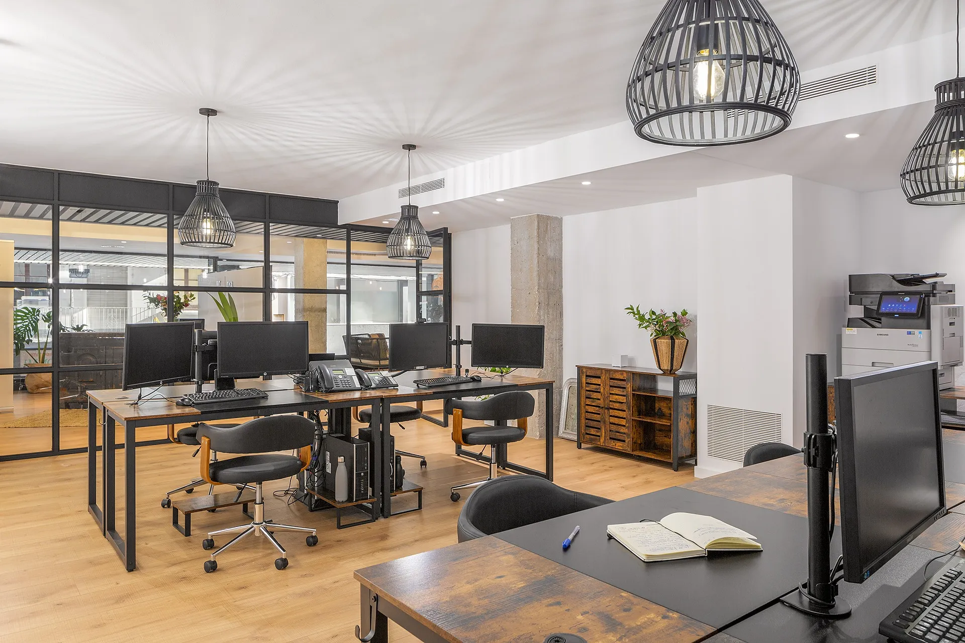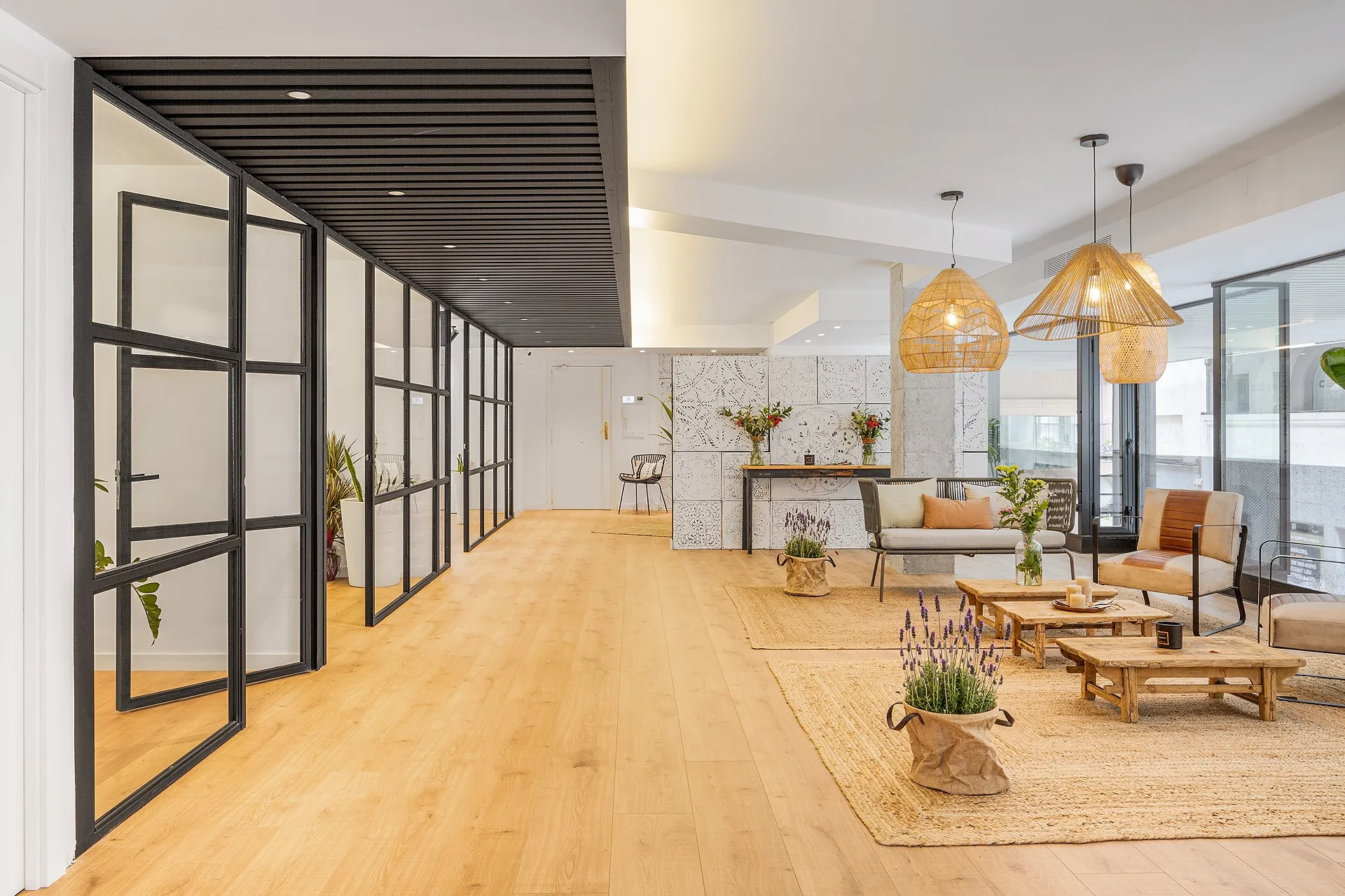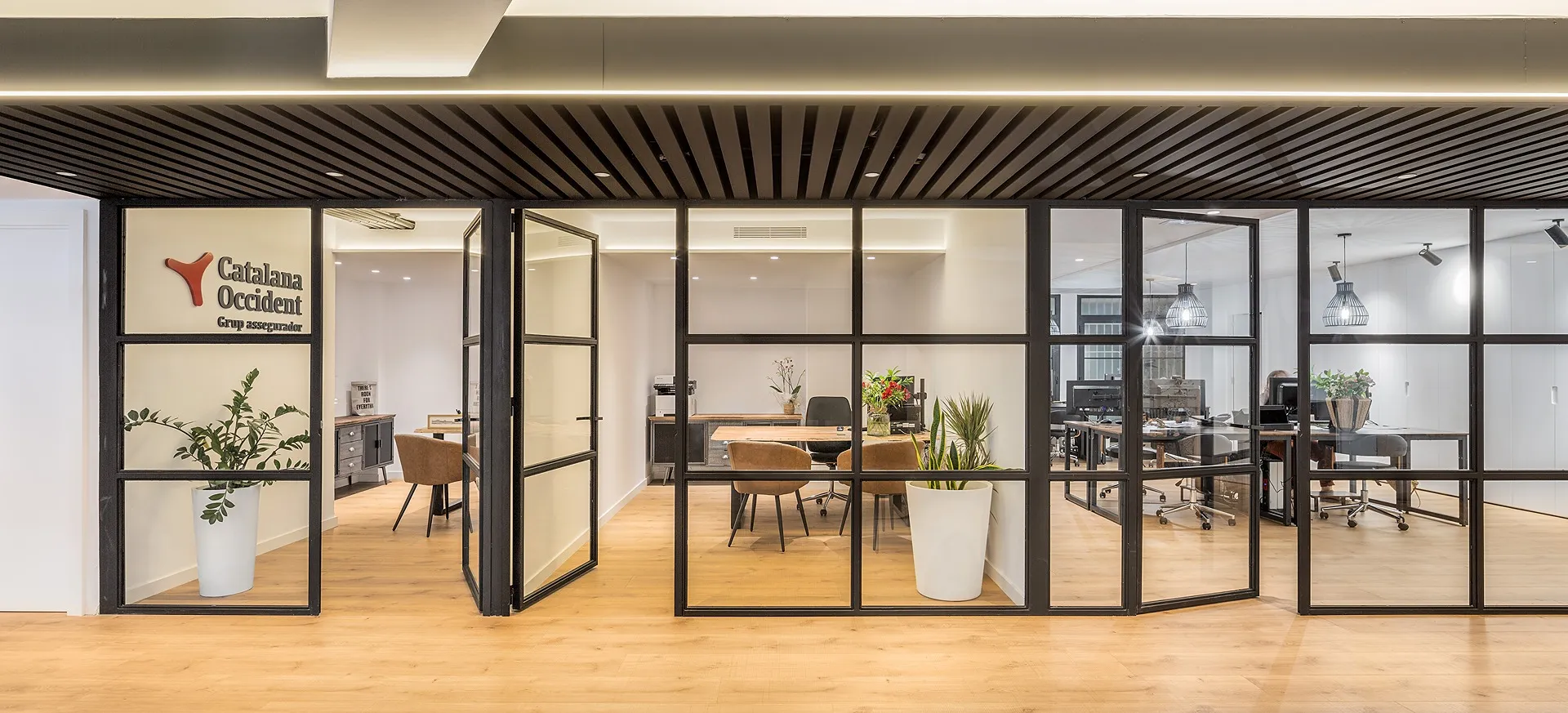 A l’entrada, una estructura metàl·lica de lames negres defineix la transició entre la zona comuna i l’àrea de treball intern. Aquesta estructura es complementa amb una successió de tancaments de vidre del mateix estil, que aporten transparència i continuïtat visual, tot mantenint la privadesa necessària.