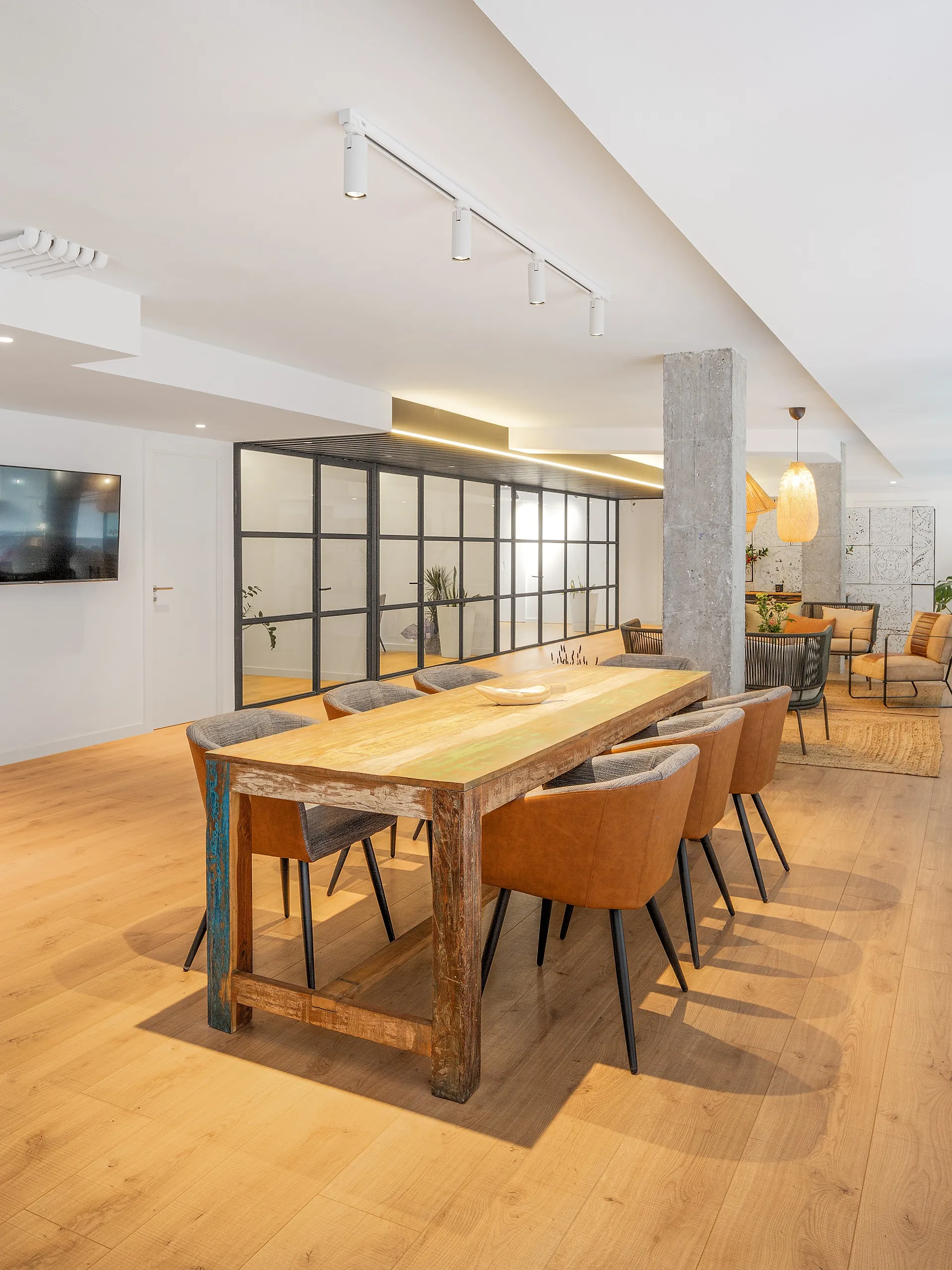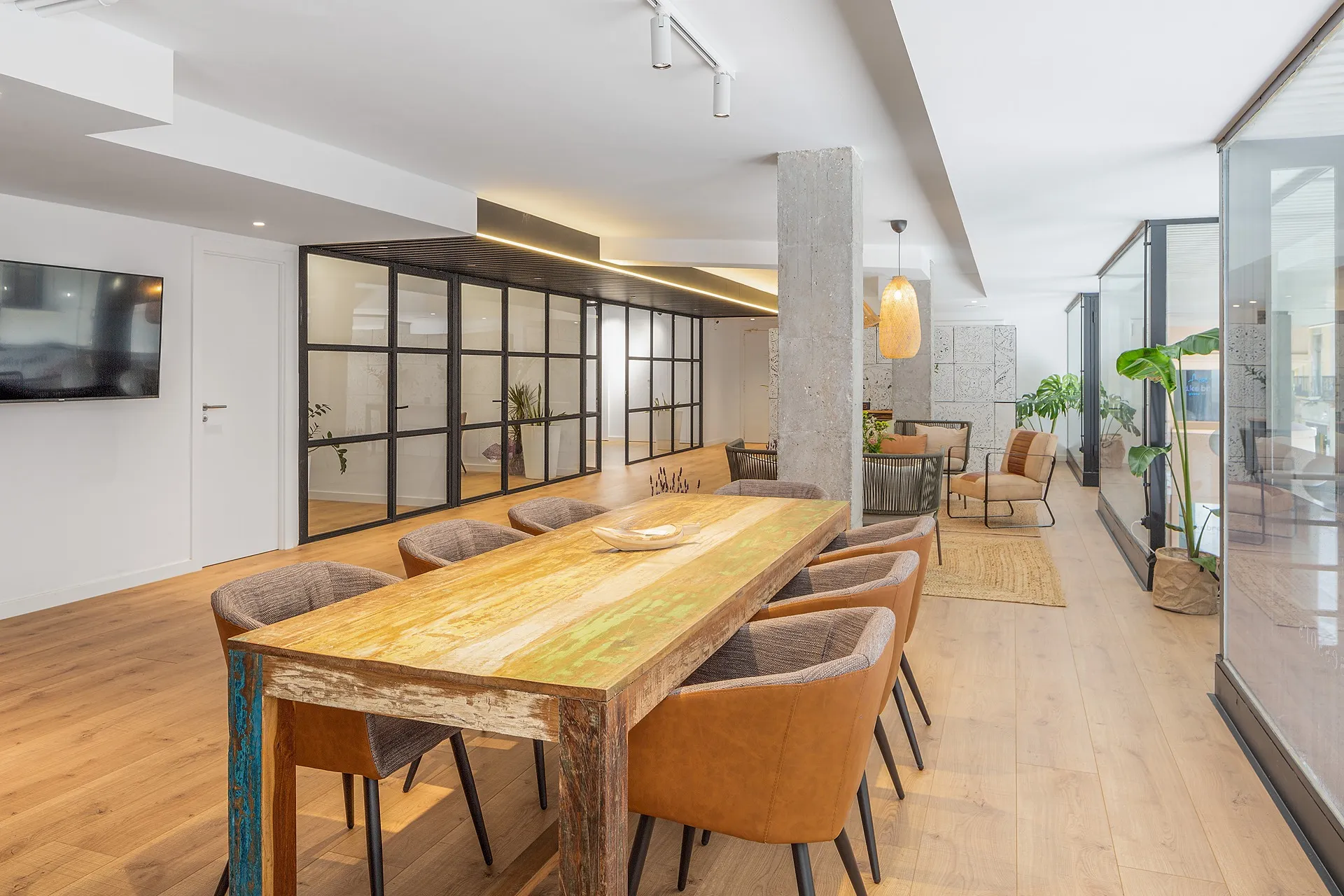 L’àmbit central s’organitza com un gran espai comú que connecta directament amb la façana i la llum natural. Aquí s’hi disposa la recepció, una zona d’estada amb sofàs i una gran taula de reunions que actua com a punt de trobada entre treballadors i clients.