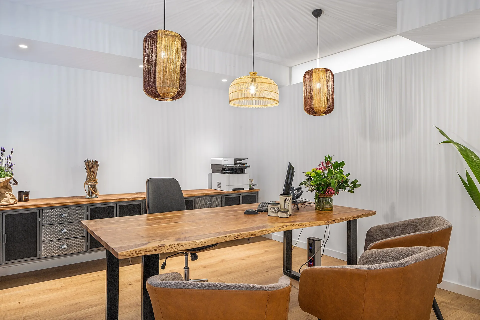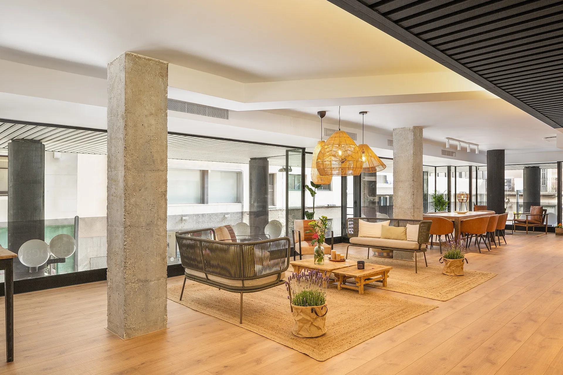 Els materials (fusta natural, ferro lacat i textures tèxtils) s’han escollit per aconseguir un ambient càlid i confortable, equilibrant el caràcter corporatiu amb una estètica contemporània i acollidora.