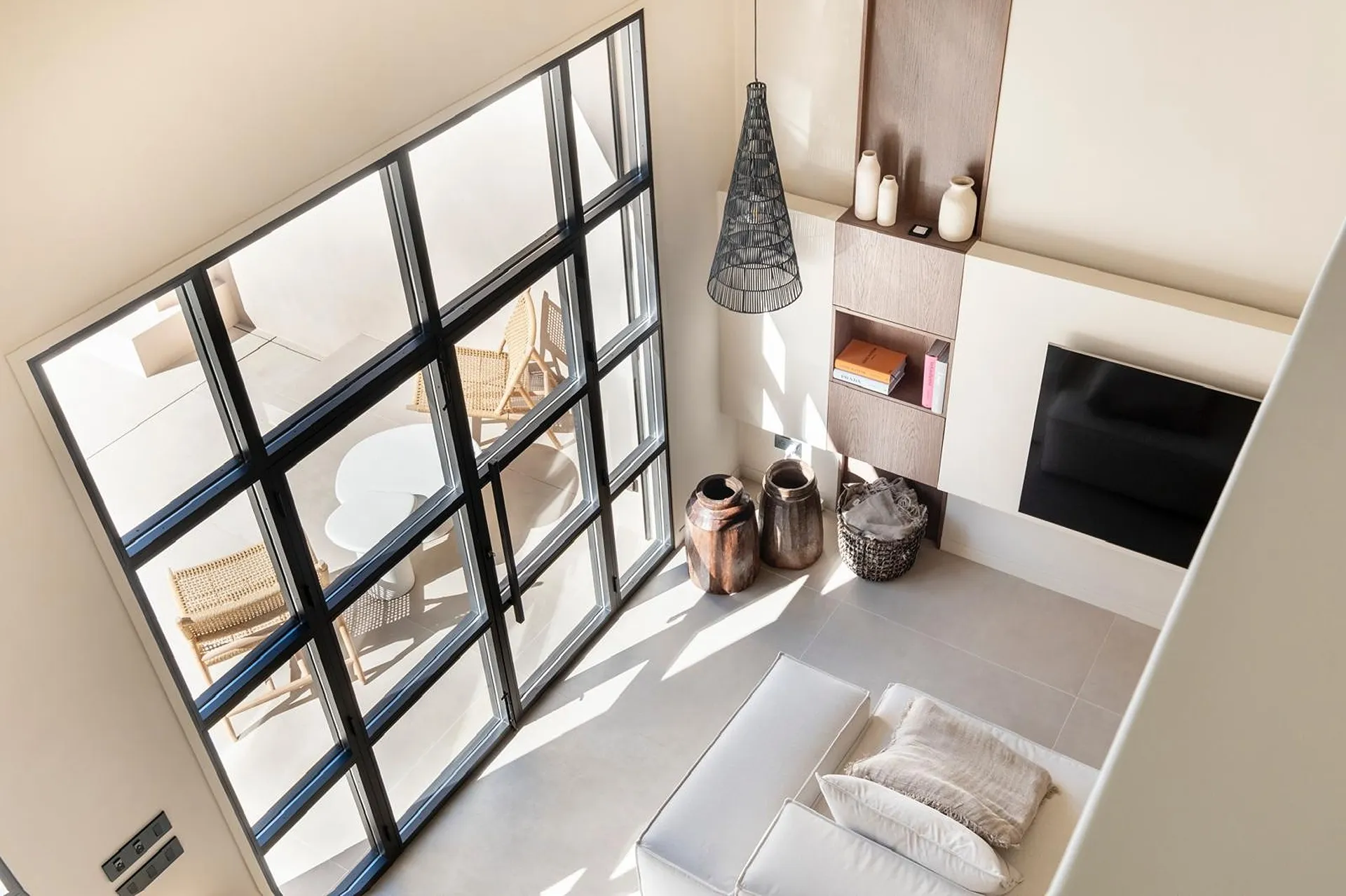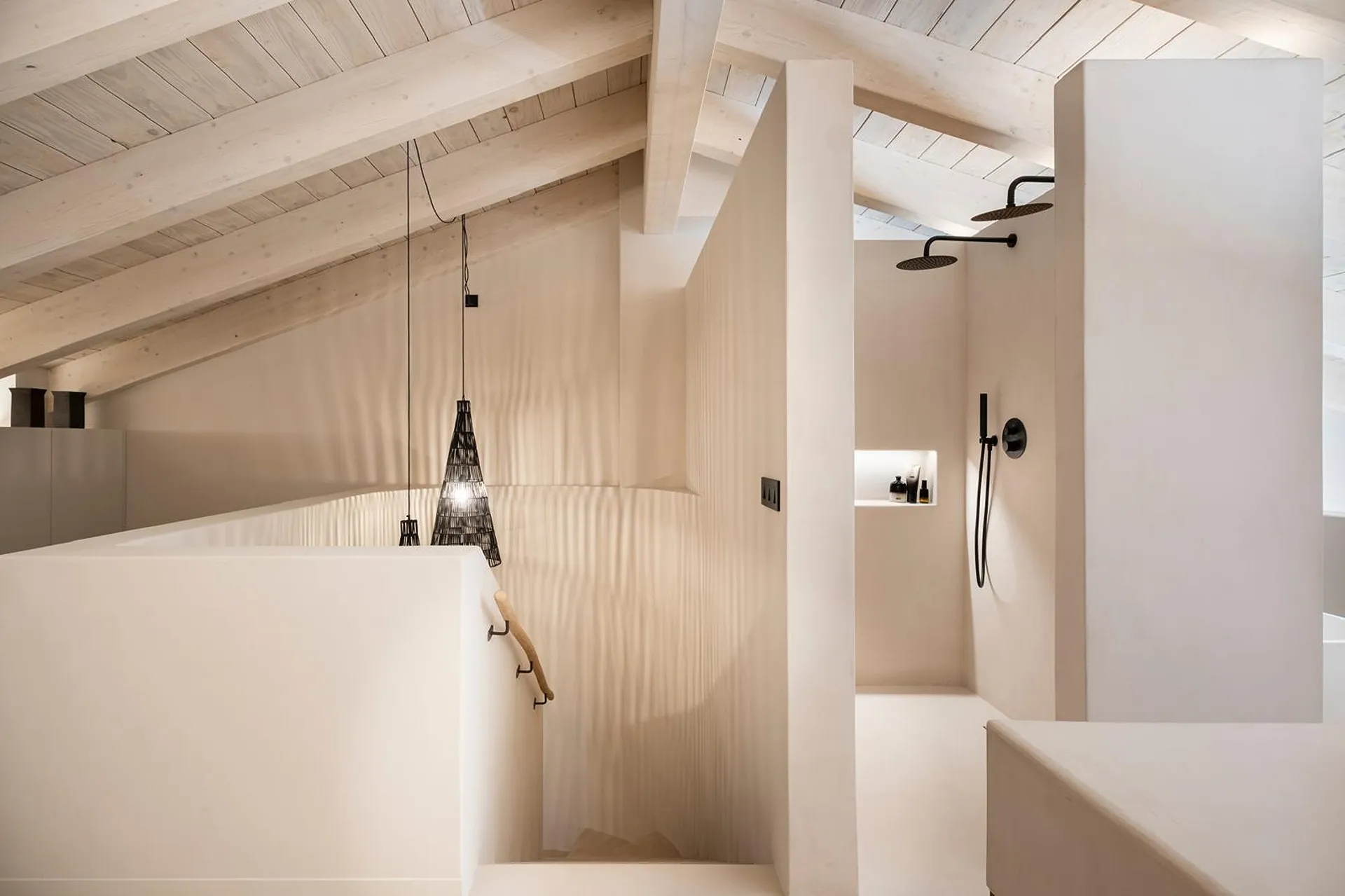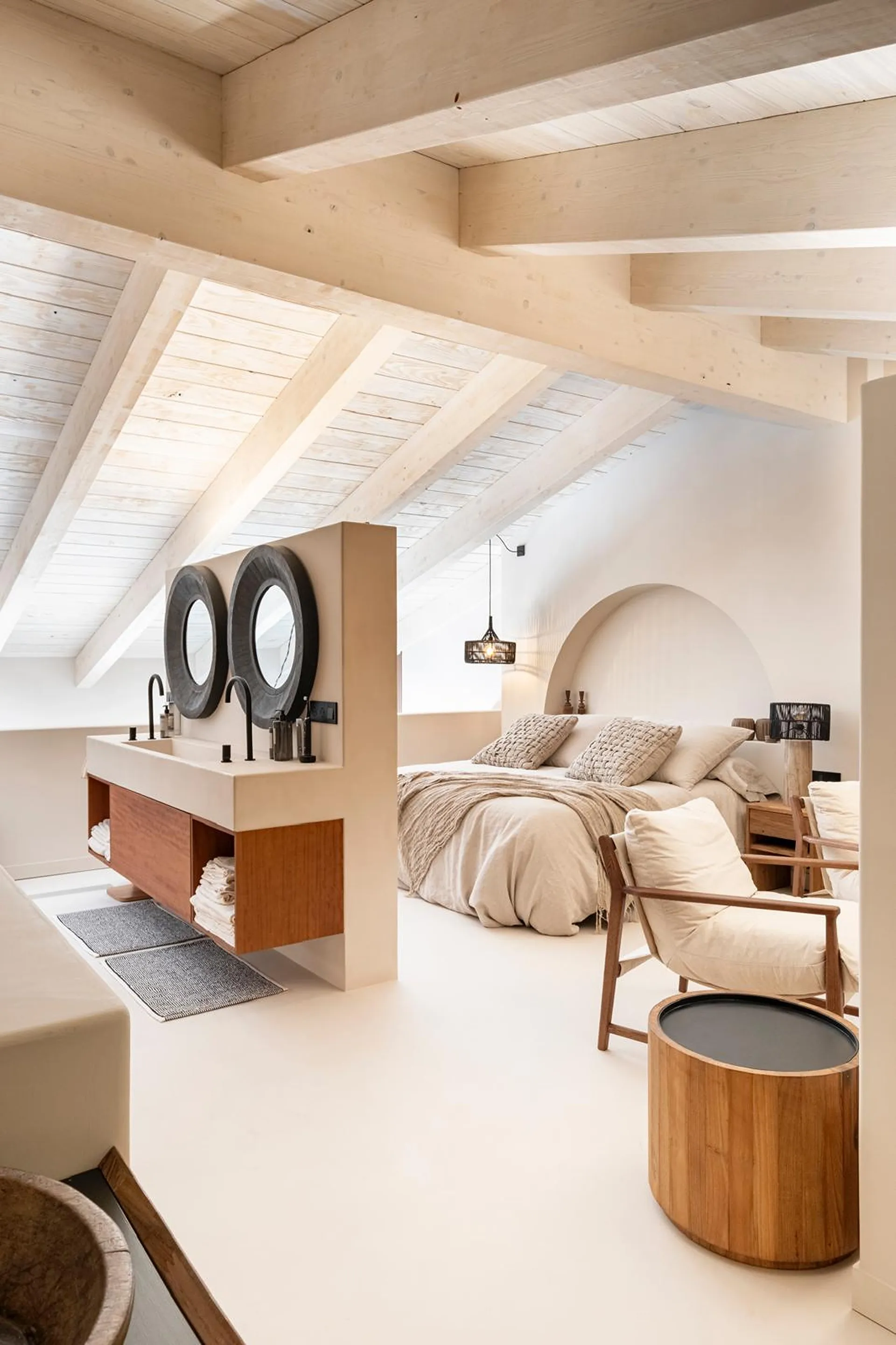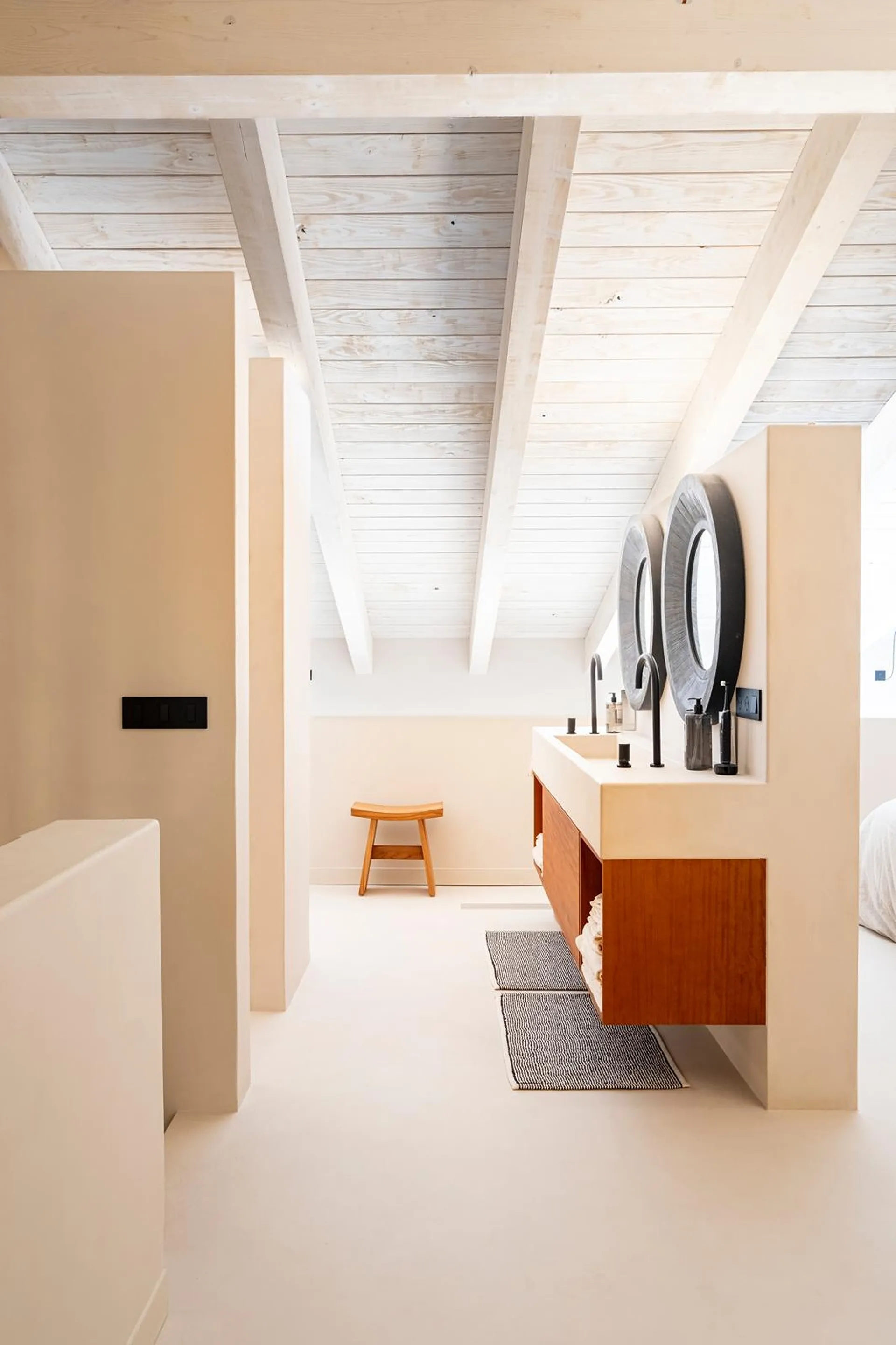L’alçada de l’edifici permet generar una nova planta superior, destinada a una gran suite amb vestidor, bany i zona de treball. Aquesta planta es relaciona visualment amb la sala de la planta baixa, establint una connexió espacial oberta i fluida entre nivells.