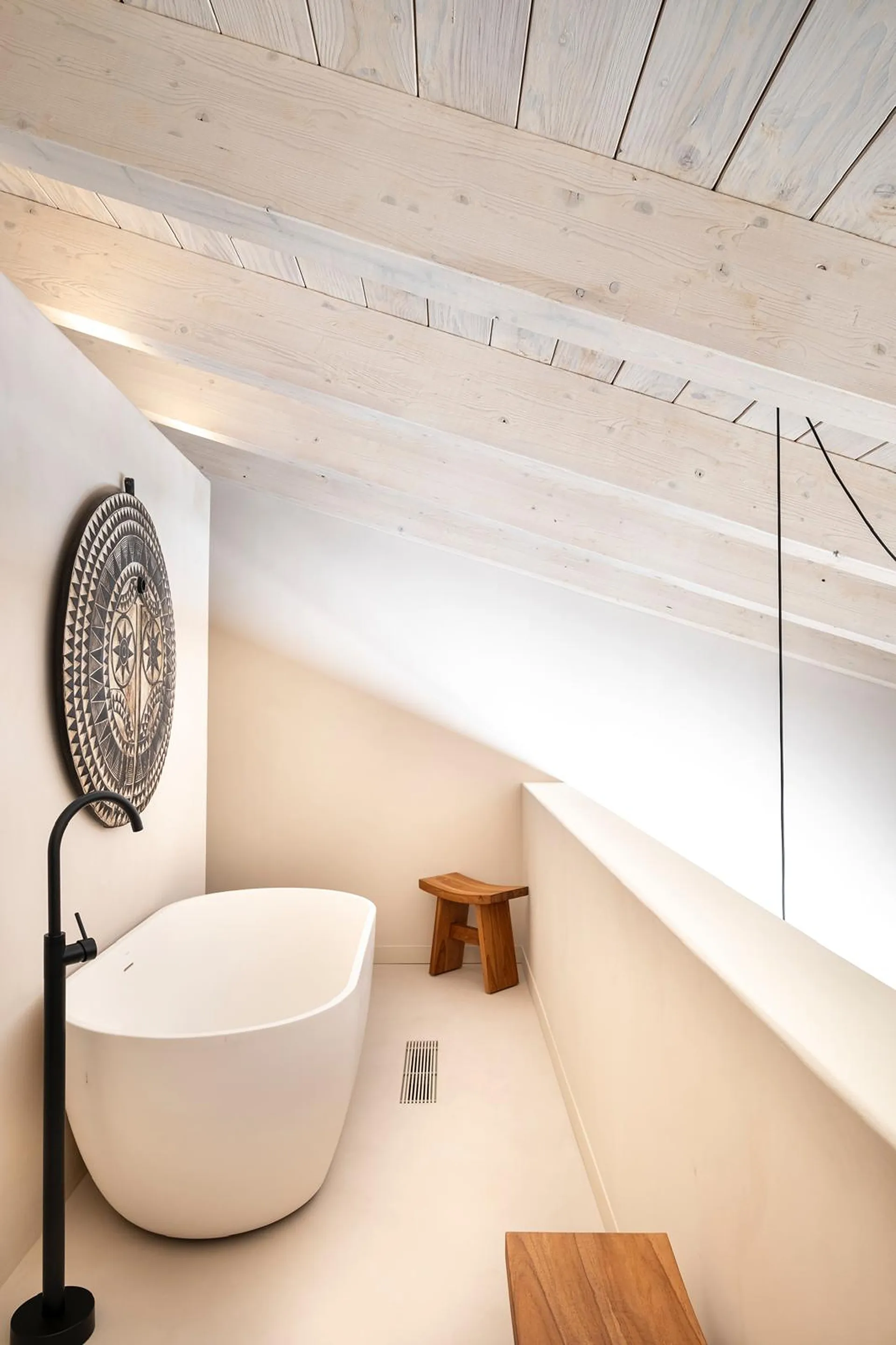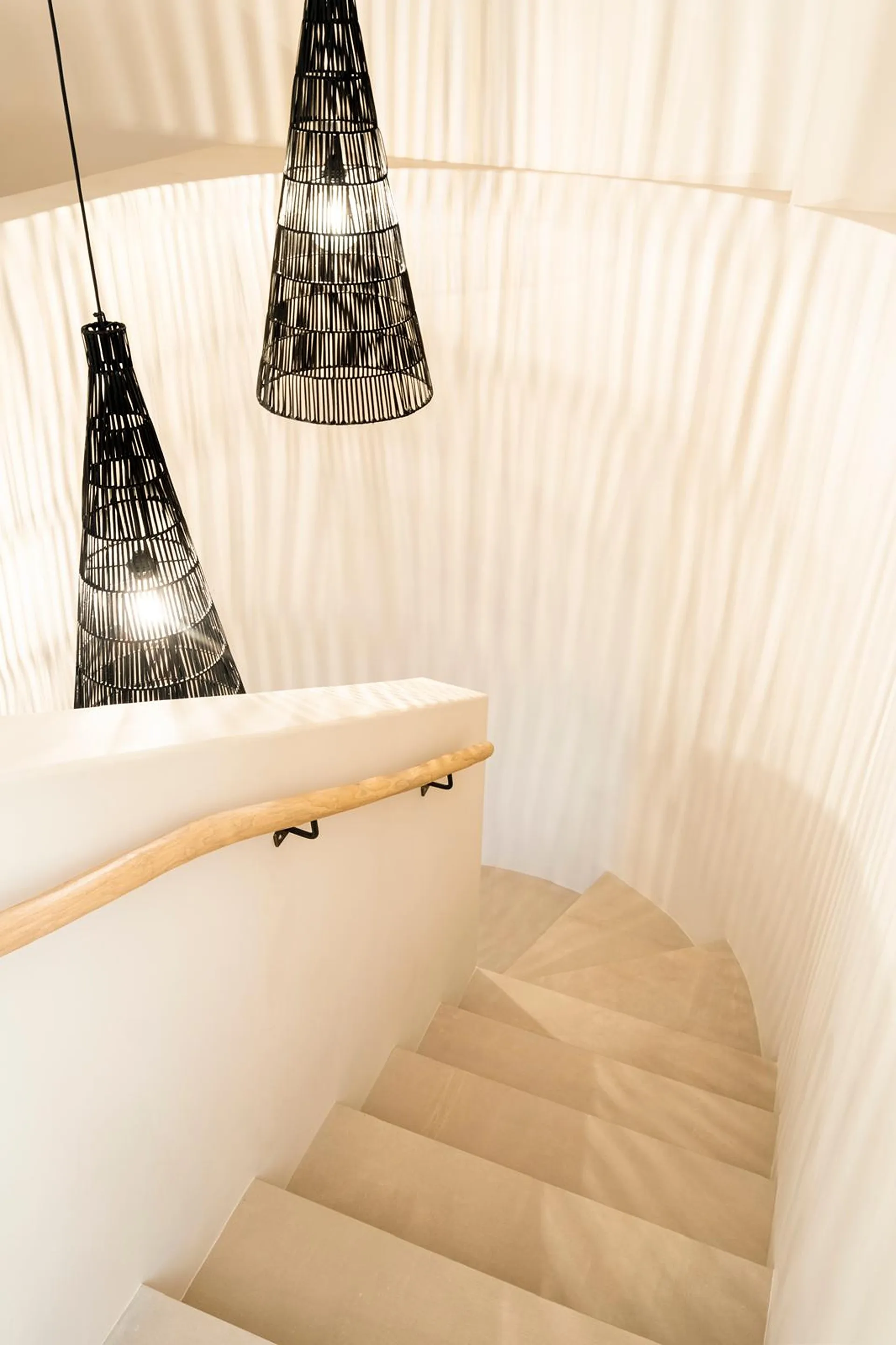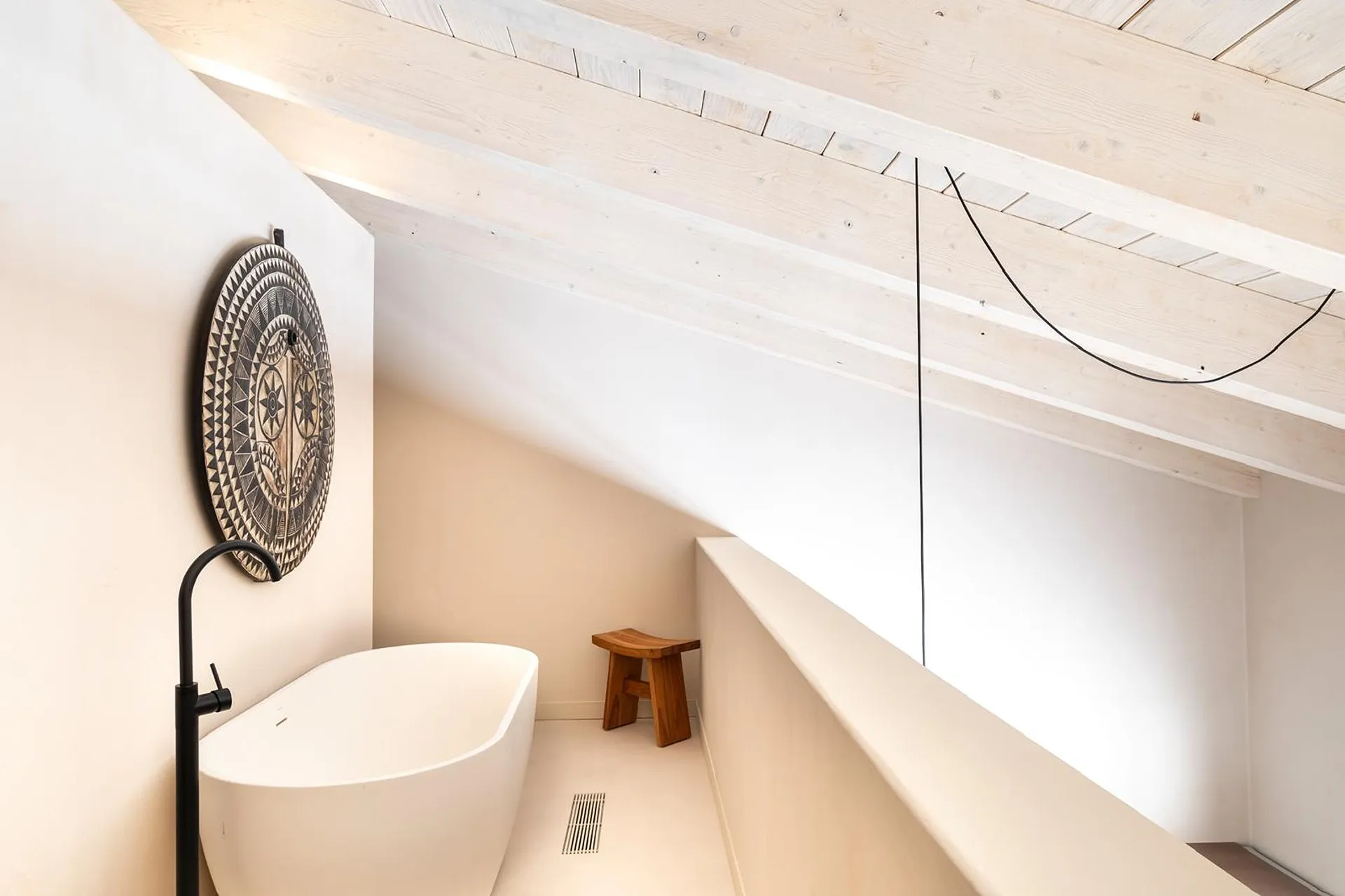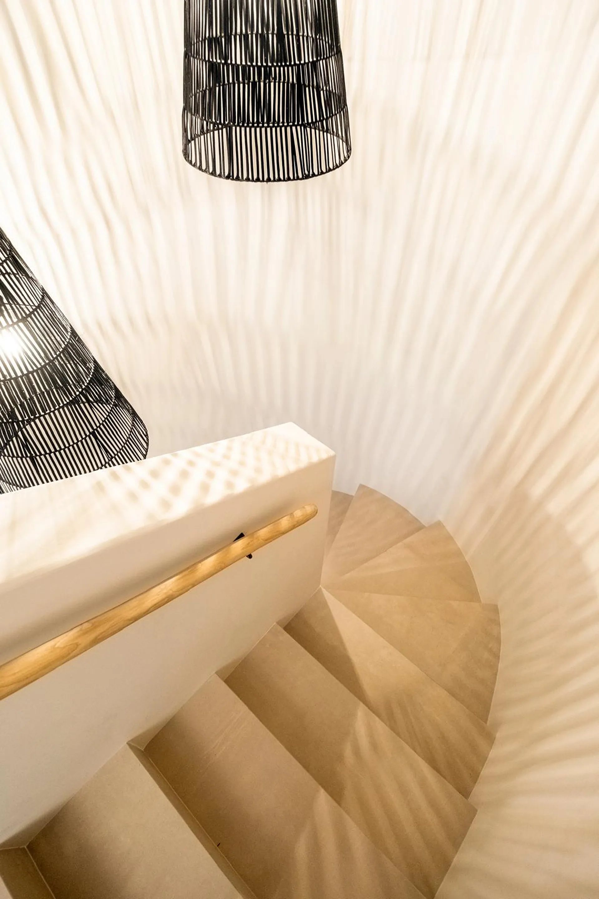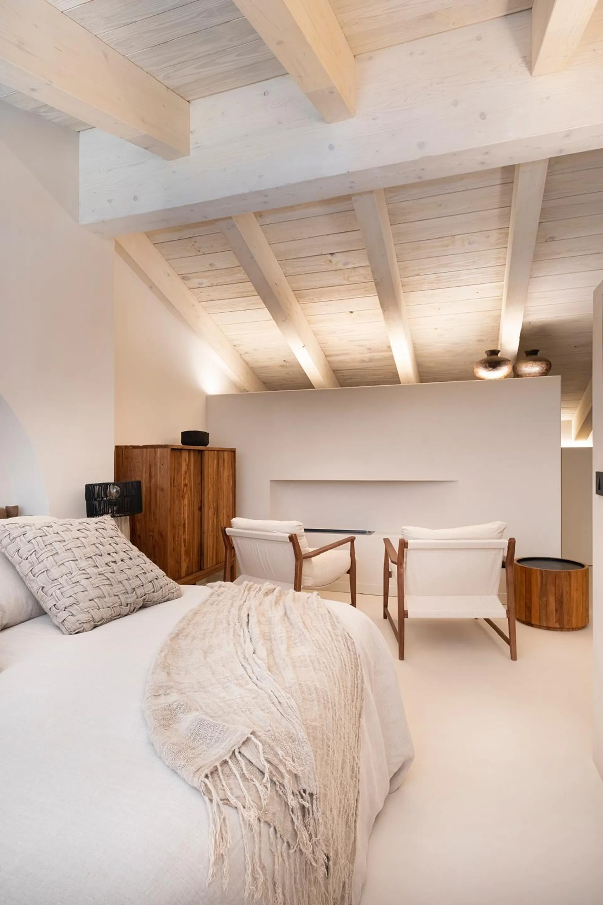 L’alçada de l’edifici permet generar una nova planta superior, destinada a una gran suite amb vestidor, bany i zona de treball. Aquesta planta es relaciona visualment amb la sala de la planta baixa, establint una connexió espacial oberta i fluida entre nivells.