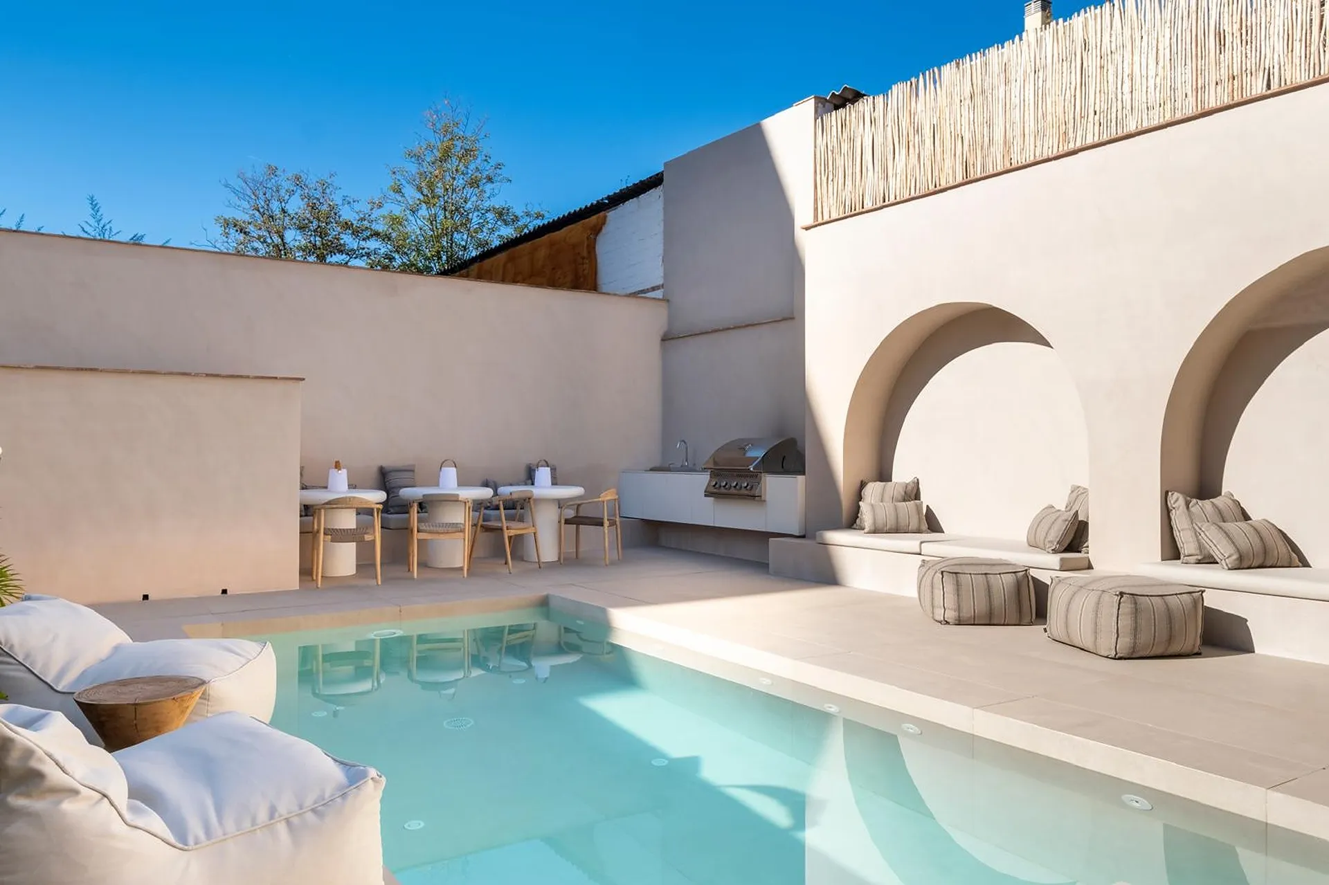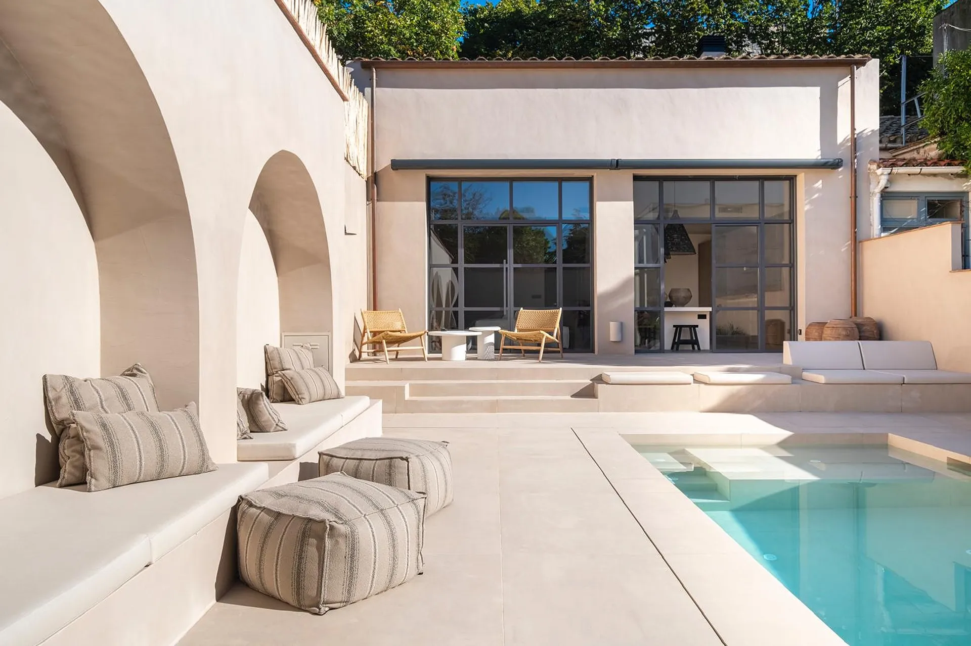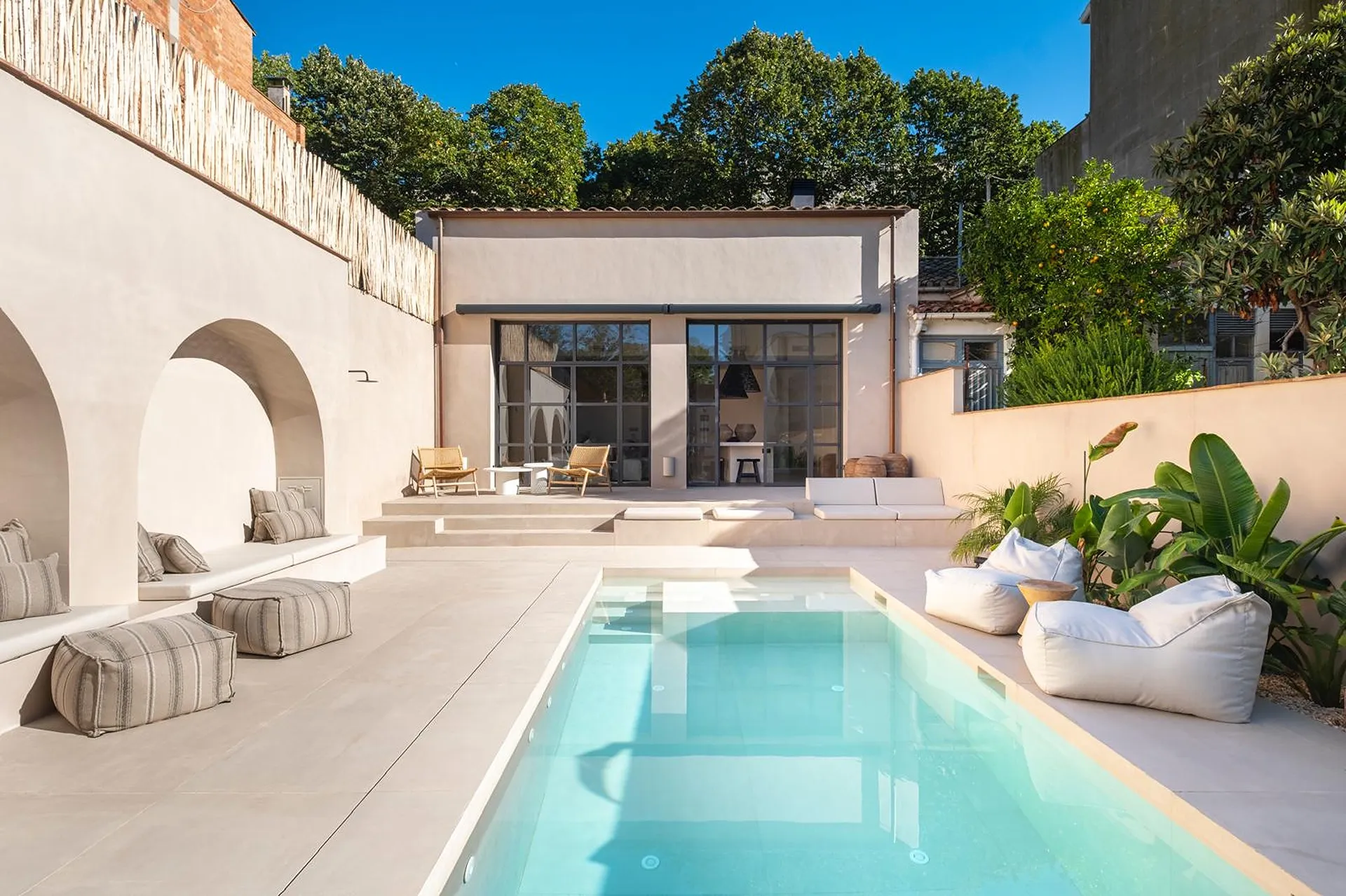 A la planta baixa s’hi crea un espai diàfan on sala i cuina es connecten amb el jardí, que incorpora una piscina i diverses zones d’estada i barbacoa. En aquest nivell també s’hi disposa un dormitori i un bany.