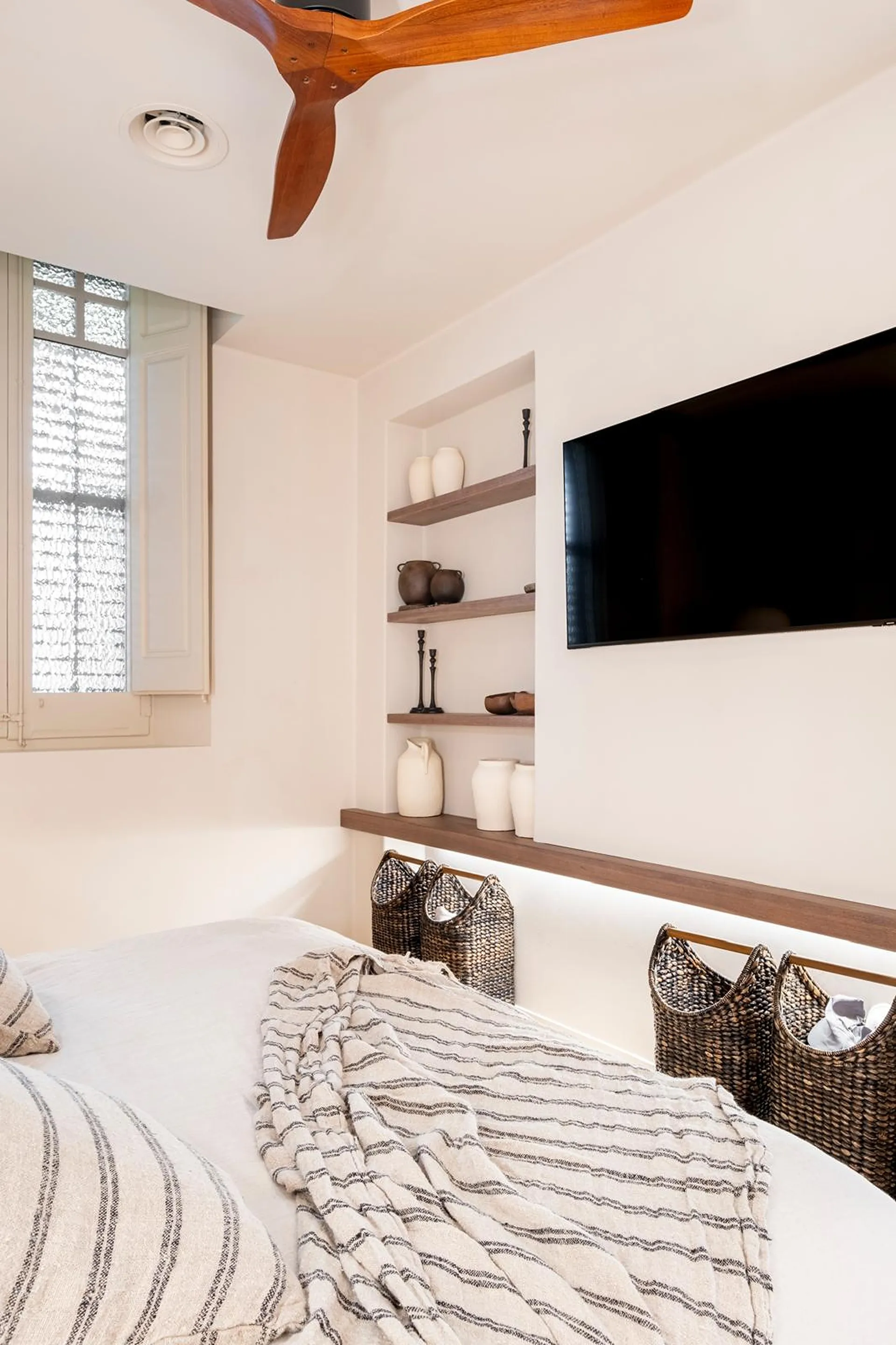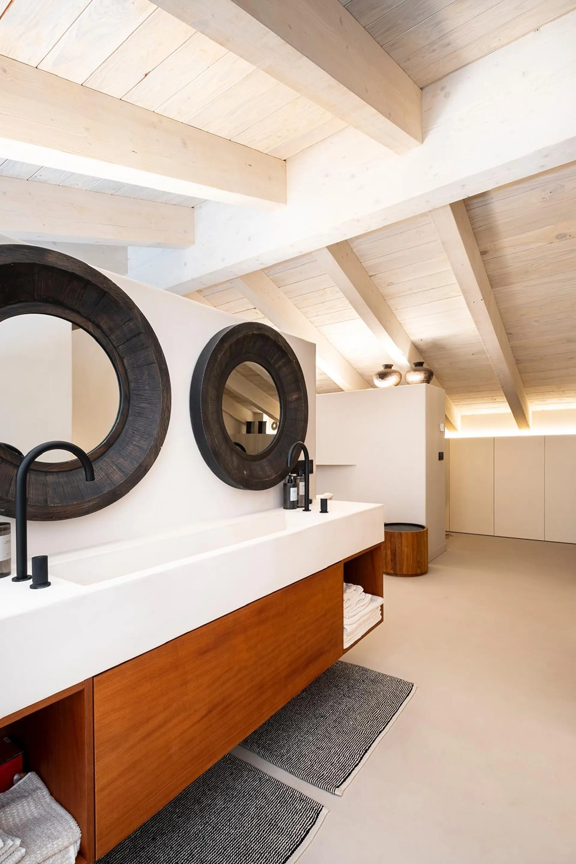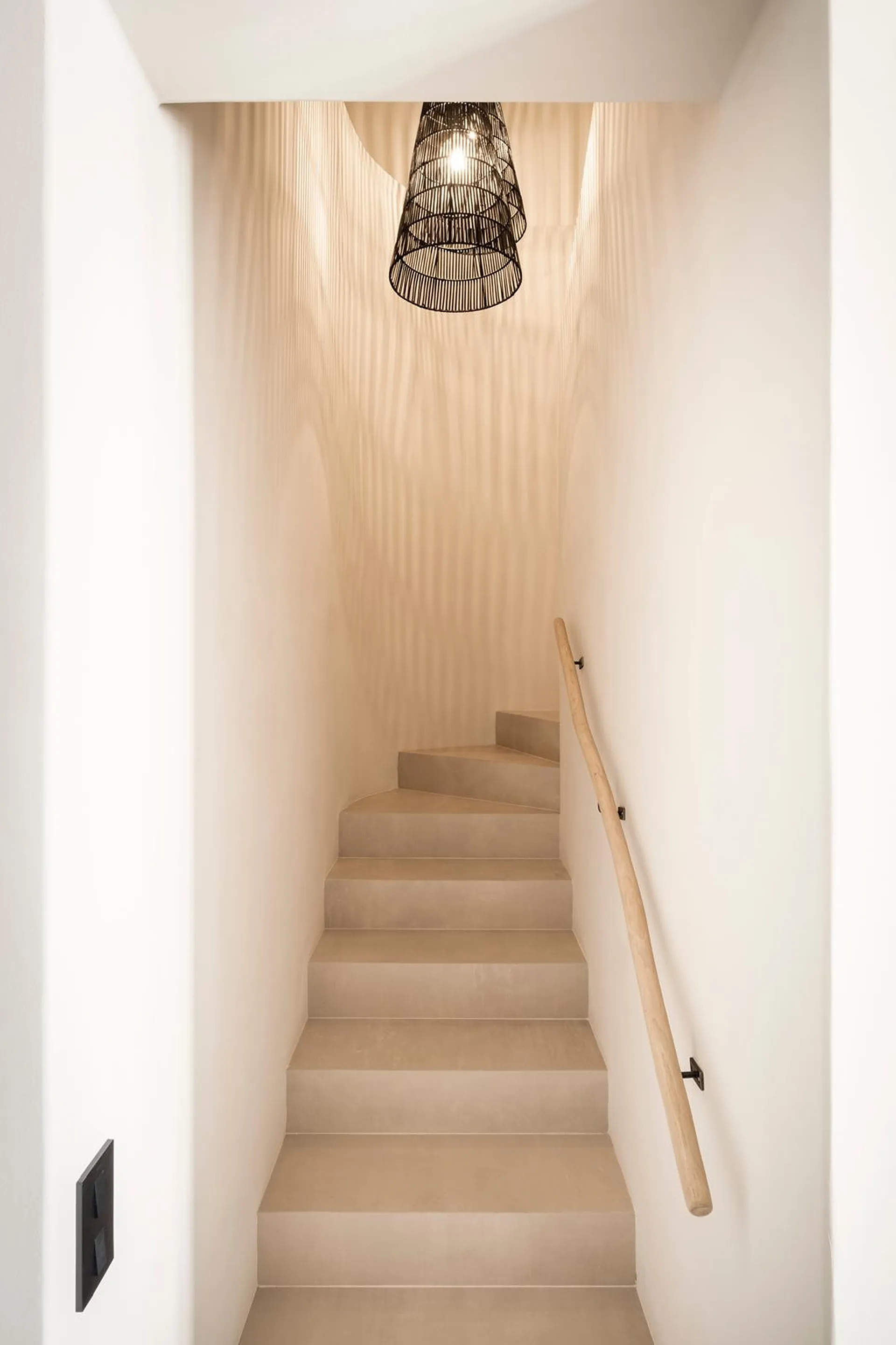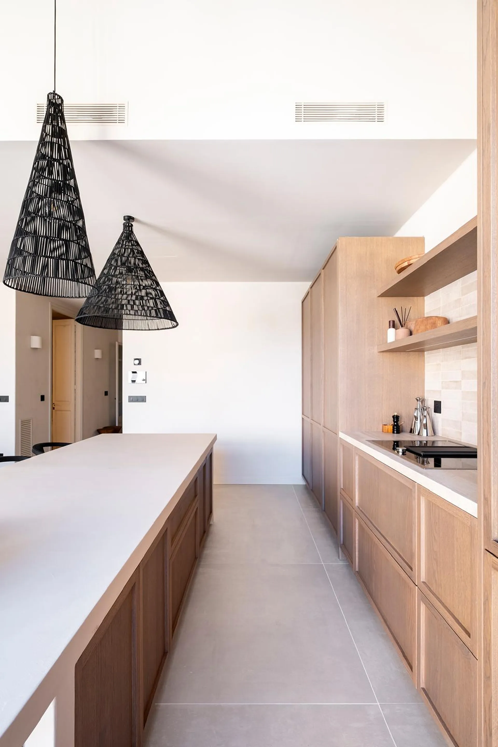 L’interiorisme aposta per una selecció acurada i reduïda de materials, com el microciment i la fusta, que defineixen un estil mediterrani contemporani i confereixen calidesa a l’habitatge.