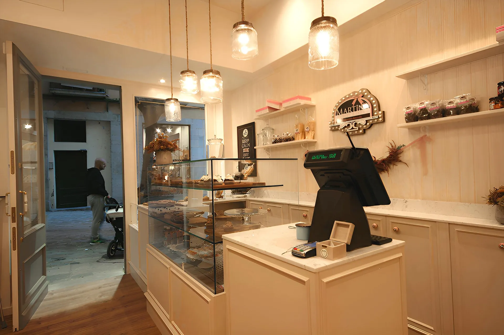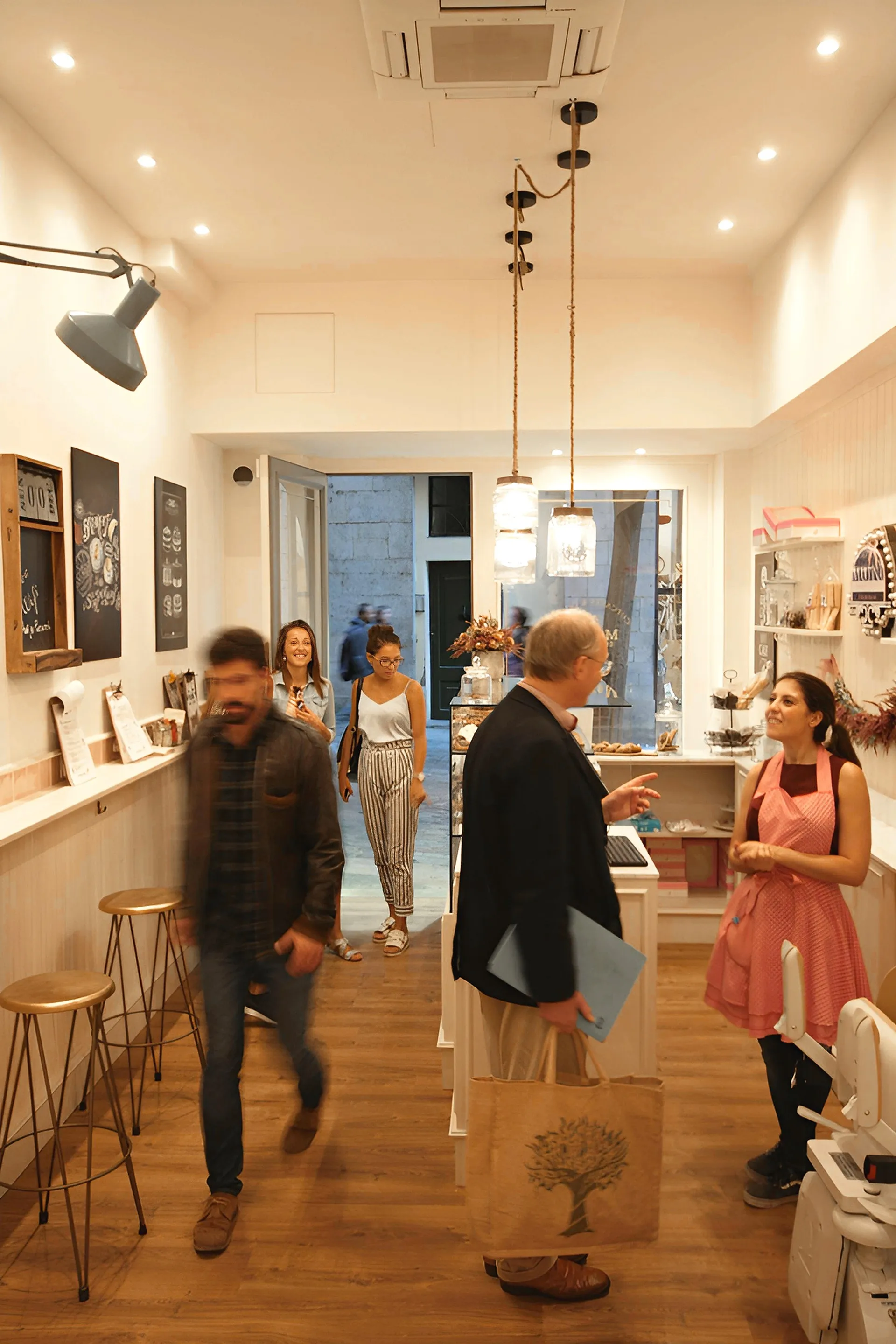 The spatial sequence is organized as a progressive journey: from the open sales area facing the street, bright and welcoming, to an interior room that integrates the open kitchen and highlights the original stone walls. The hydraulic flooring and warm lighting unify the whole and provide a cozy character.