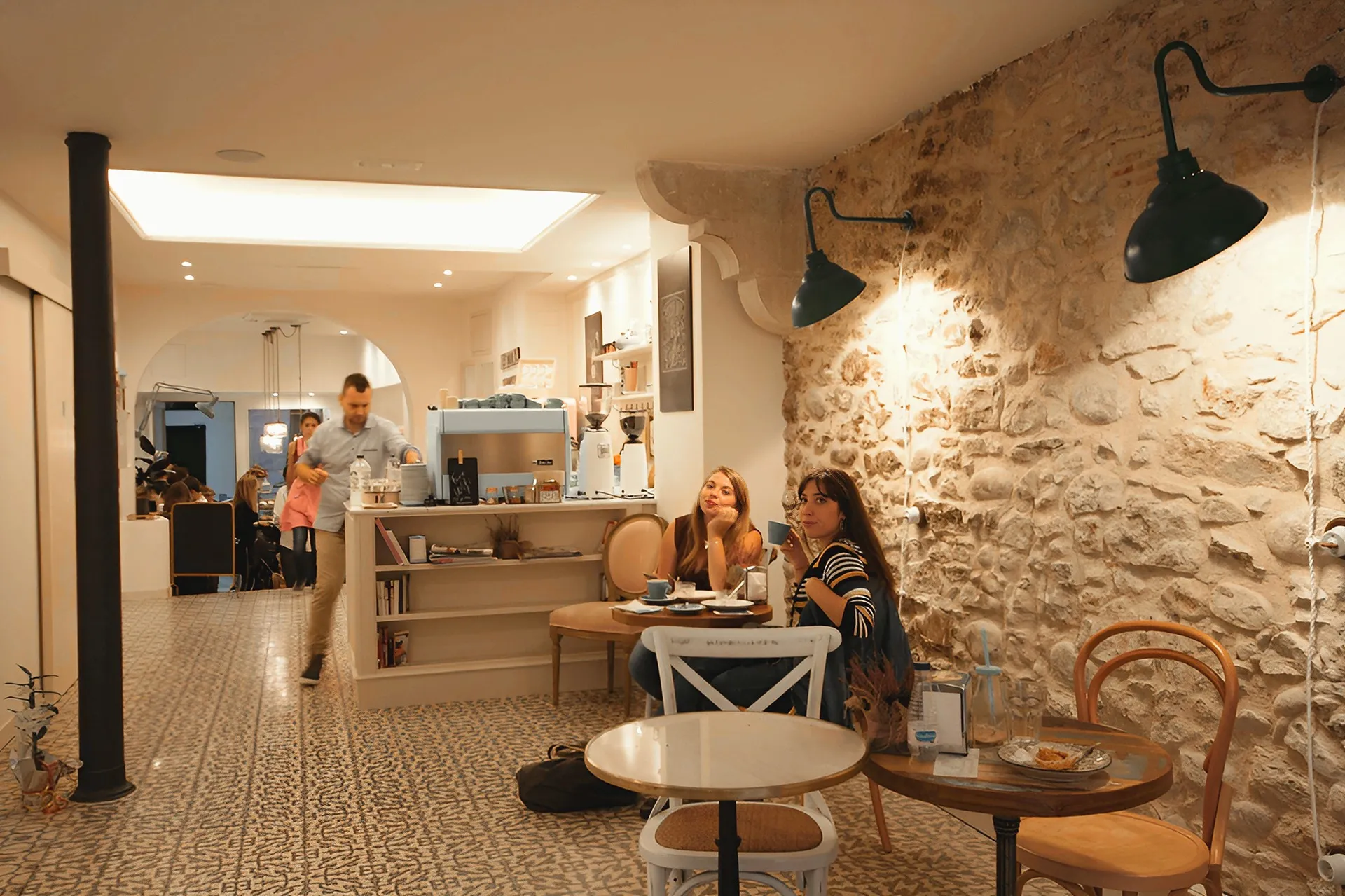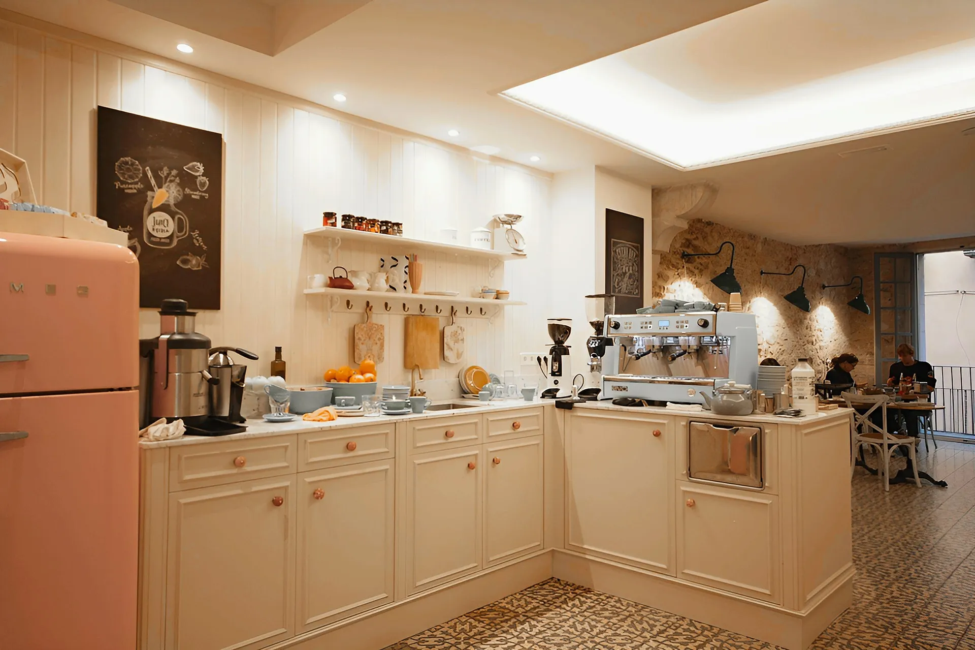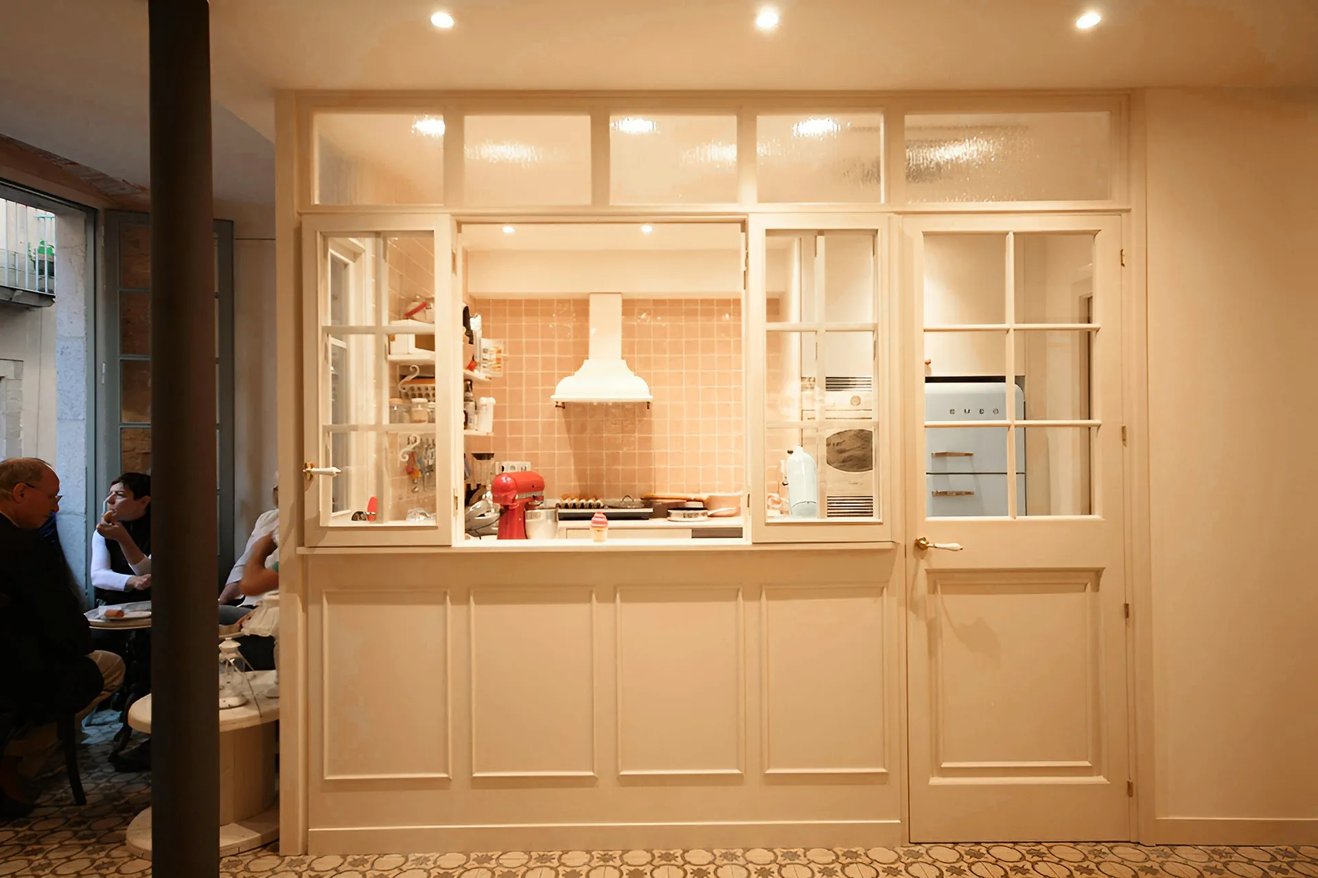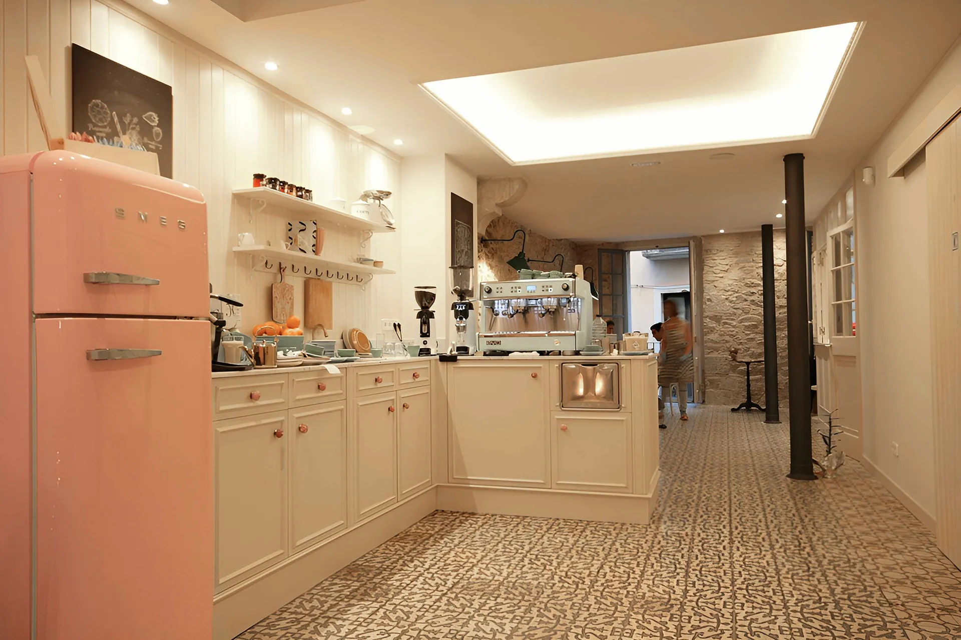 The project transforms a narrow space in the Old Town into a warm environment that combines a workshop and café under one common concept: bringing craftsmanship closer to the visitor. The interior design is based on a reinterpreted domestic aesthetic —soft colors, custom furniture, and vintage appliances— to generate proximity and naturalness.